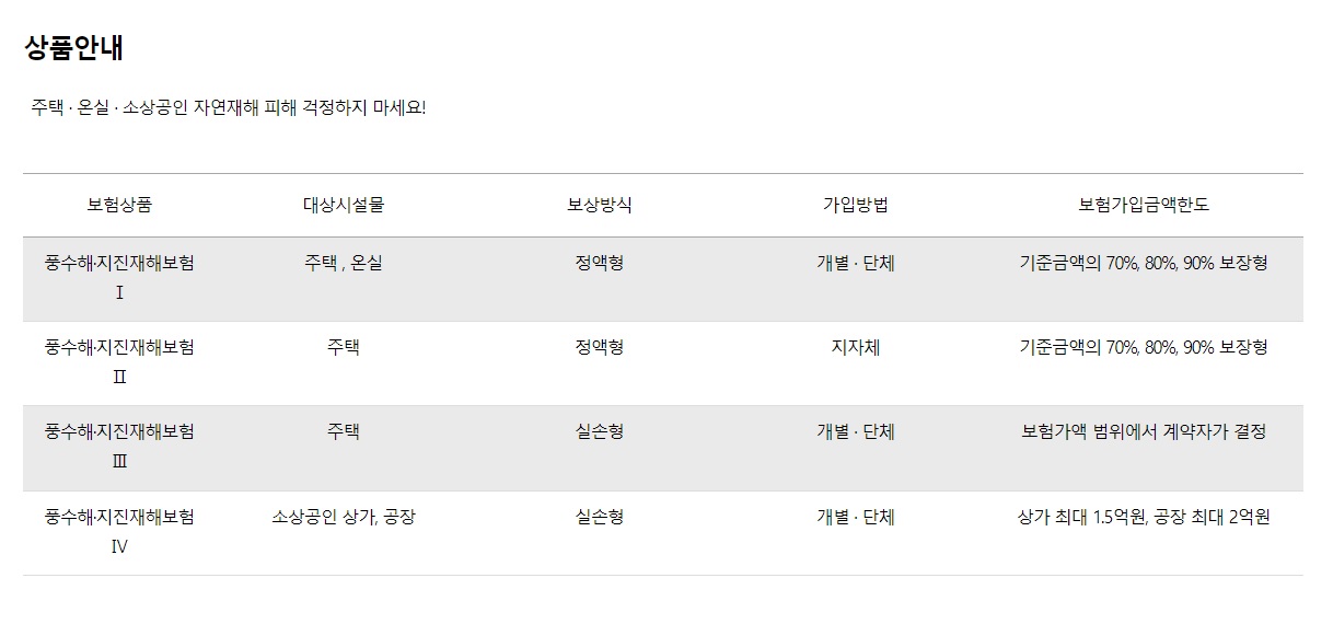 하지만 아무리 준비를 철저히 한다해도 예기치 않은 피해가 발생 하곤 합니다 이런 자연재해로 인해 손해를 보상하는